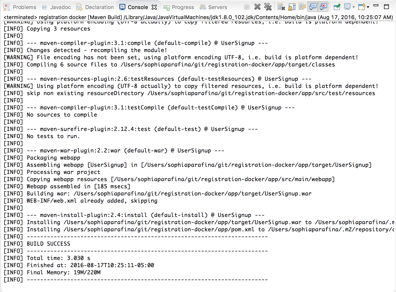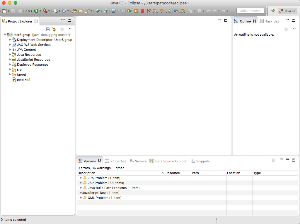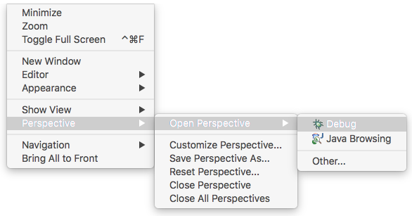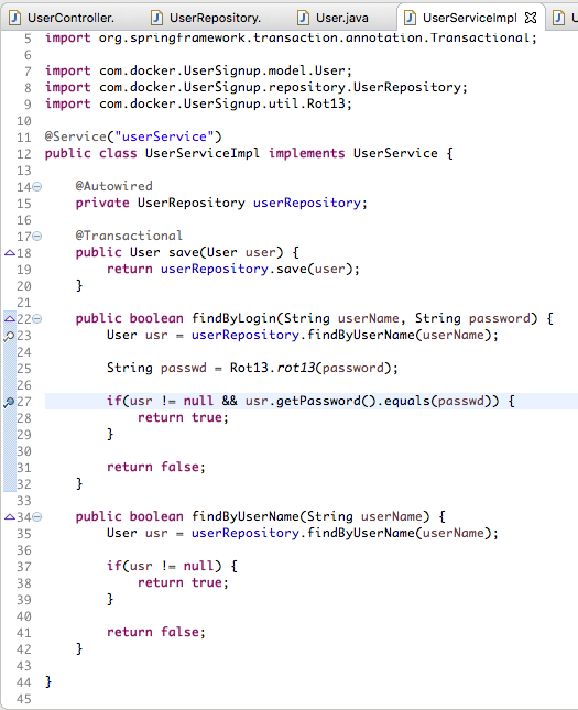 Try registering a new user using the debugger. In Eclipse, change the view or Perspective to the debugger by clicking on Window > Perspective > Open Perspective > Debug