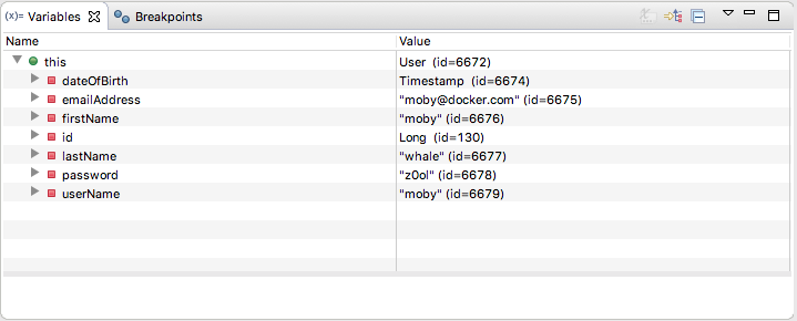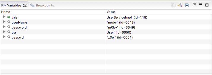 Next, set a breakpoint on the getPassword in the User class to see the value returned for password. You can also toggle off the breakpoint for setPassword.