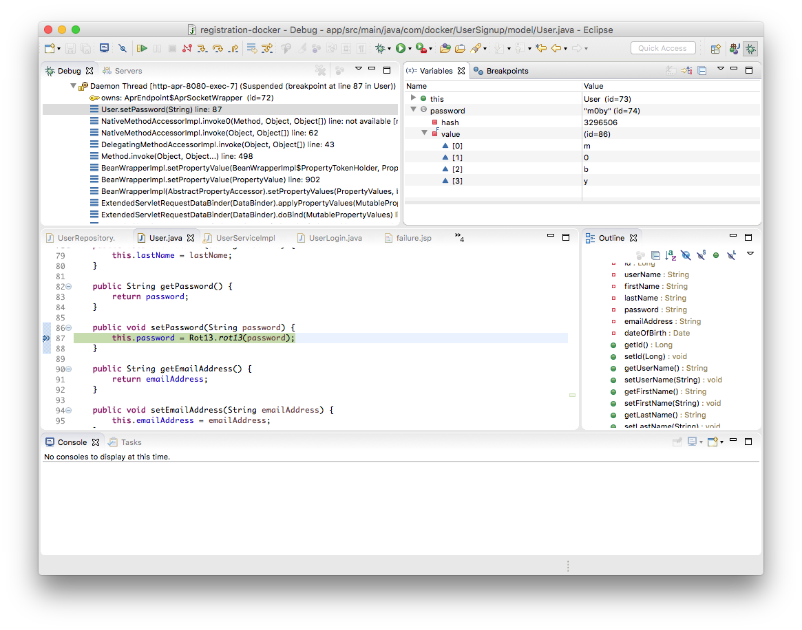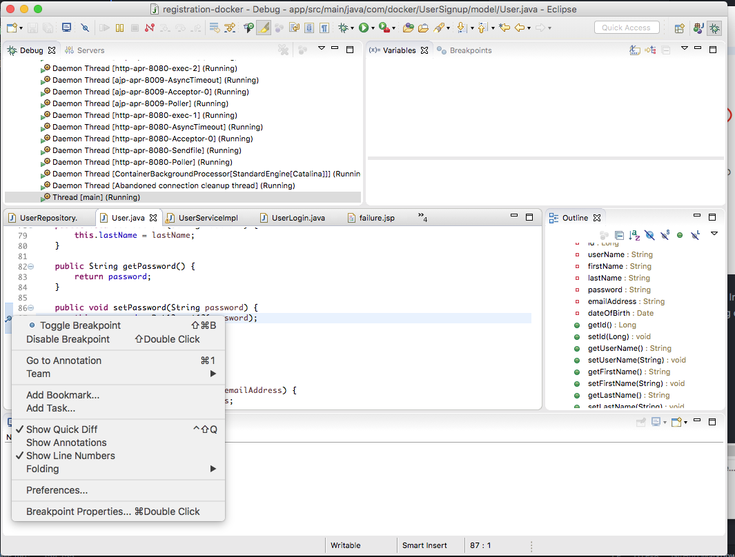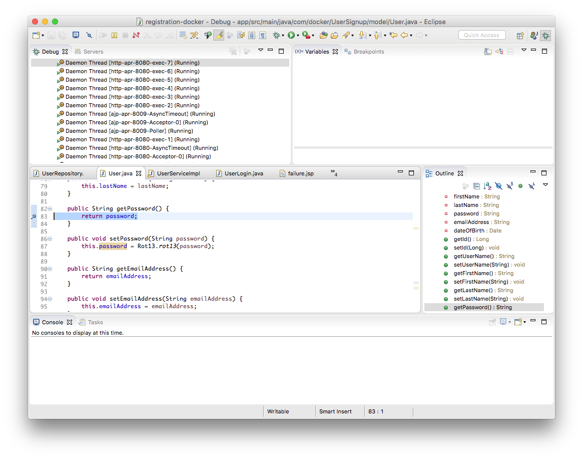 Eclipse will switch to the debug perspective. Since we enable remote debugging earlier, you should see the Daemon Threads for Tomcat in the debug window. Set a breakpoint for in the User class where the password is set.