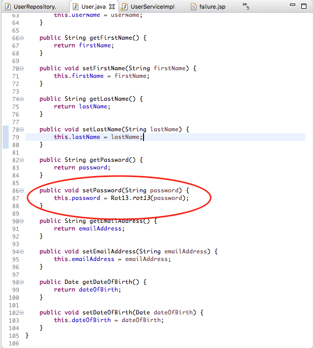 Since the problem is with the password, lets see how the password is set in the User class. In the User class, the setter for password is scrambled using rot13 before it is saved to the database.