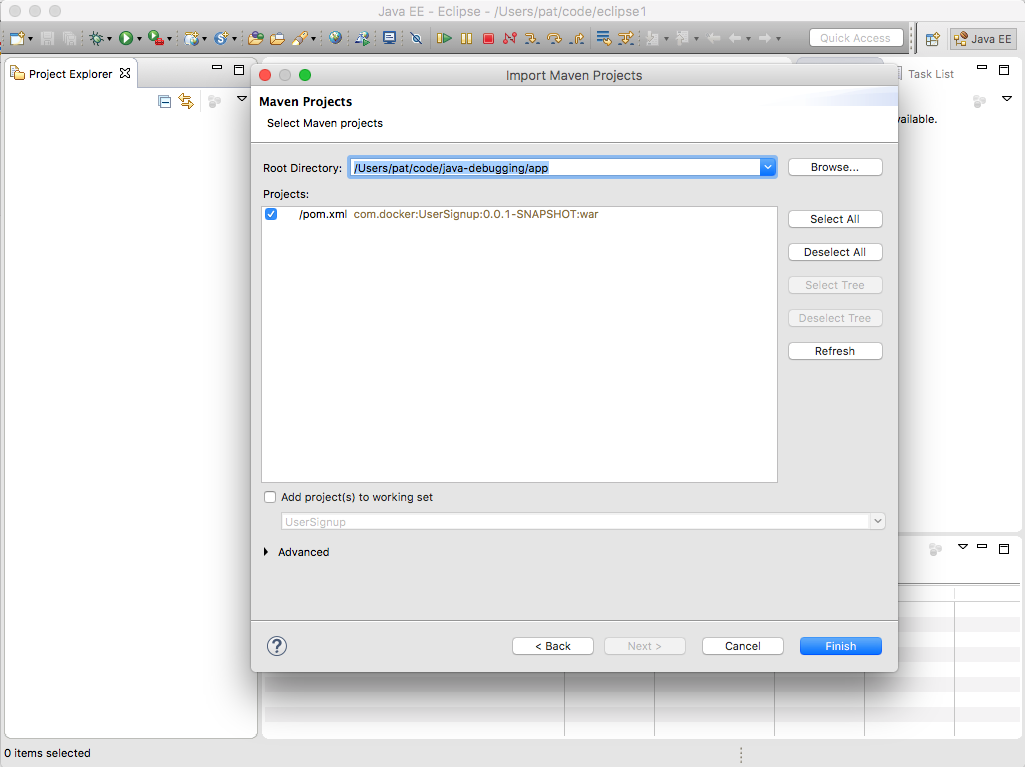Select the pom.xml from the app directory, click Finish.