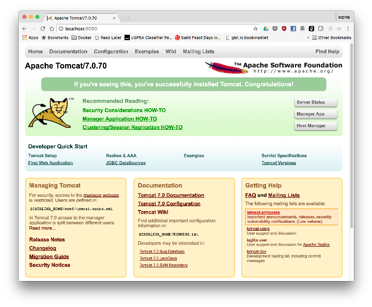 Open a browser window and go to: ‘localhost:8080’; you should see the Tomcat home page