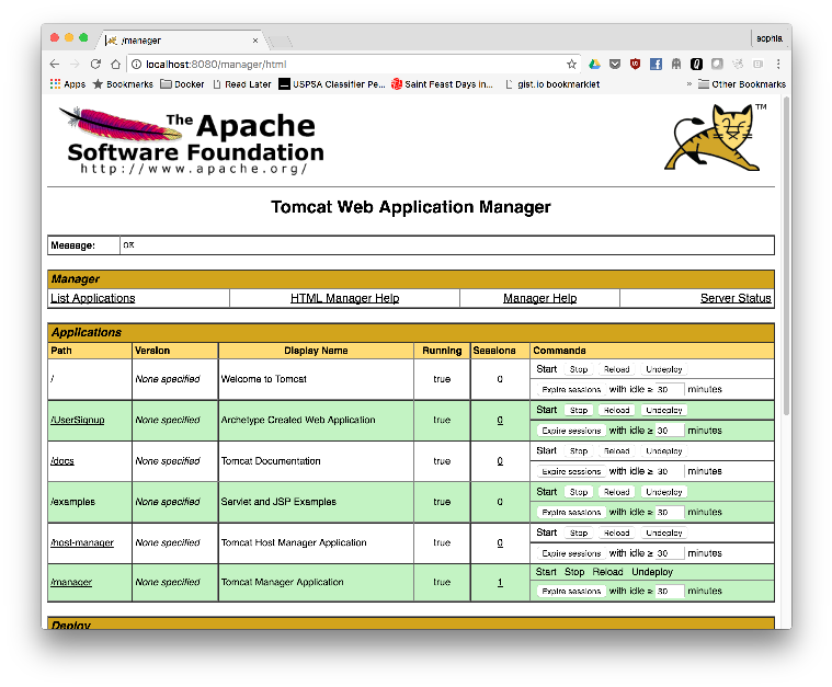 When the Tomcat image was built, the user roles were also configured. Click on the Manager App button to see the deployed applications. When prompted for username and password, enter system and manager respectively to log into the Tomcat Web Application Manager page.