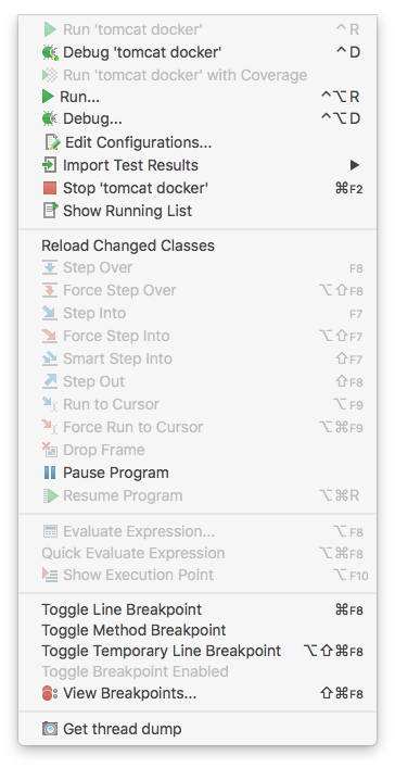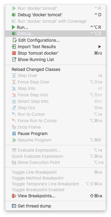Choose the remote Tomcat debug configuration. The Debugger console will be displayed at the bottom of the IntelliJ window.