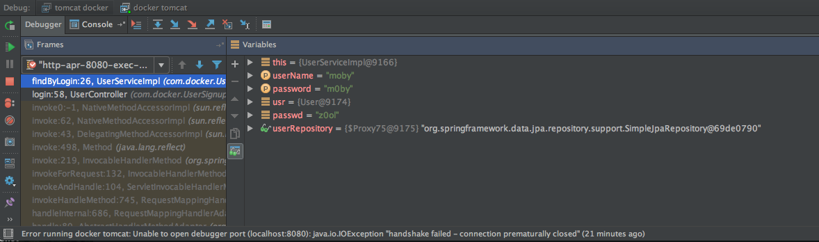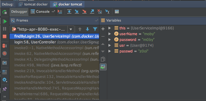 Set a breakpoint in UserServiceImpl on the findByLogin method. Log in again and look at the values for the breakpoint. The ‘passwd’ variable is z0ol which matches the password for the user moby.