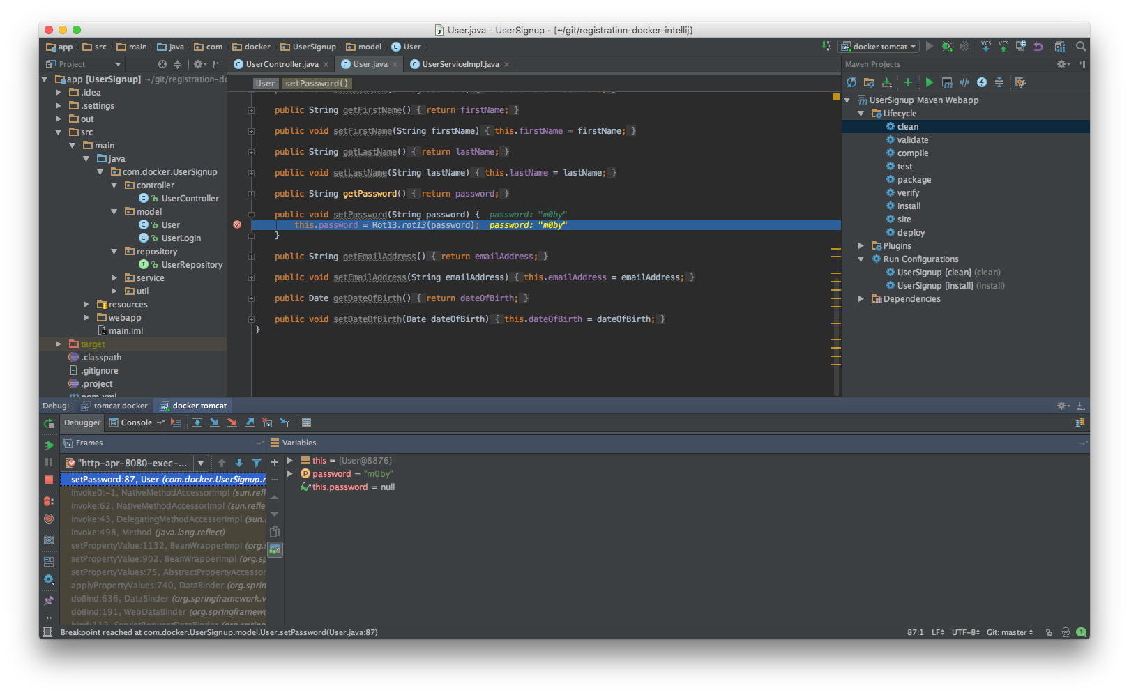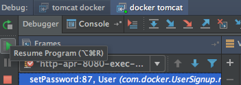 Next, set a breakpoint on the getPassword in the User class to see the value returned for password. You can also toggle off the breakpoint for setPassword.