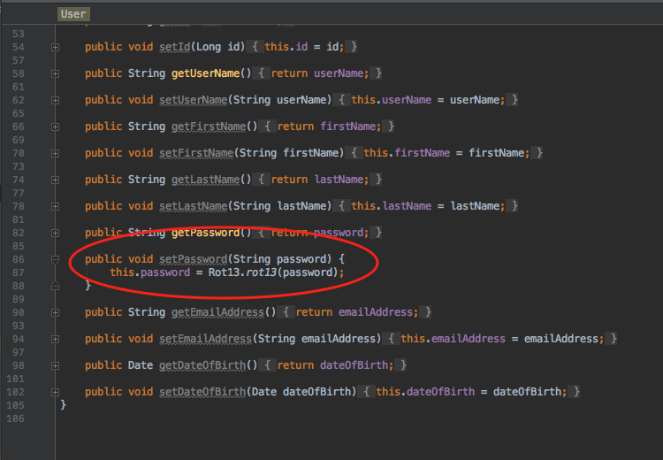 Since the problem is with the password, let’s see how the password is set in the User class. In the User class, the setter for password is scrambled using rot13 before it is saved to the database.