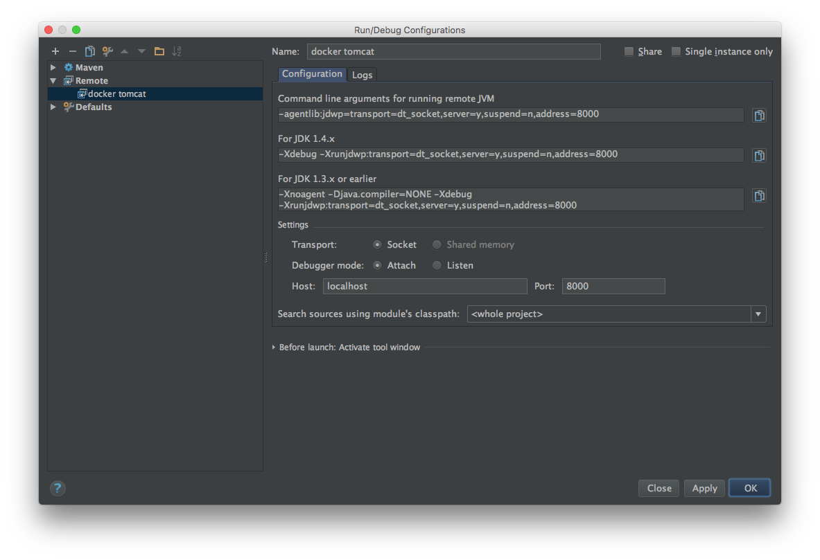 In the Run\Debug Configurations window, set the Name of the configuration as docker tomcat and in Settings set the port to ‘8000’ as the default Tomcat JPDA debuging port. Click on OK to save the configuration.
