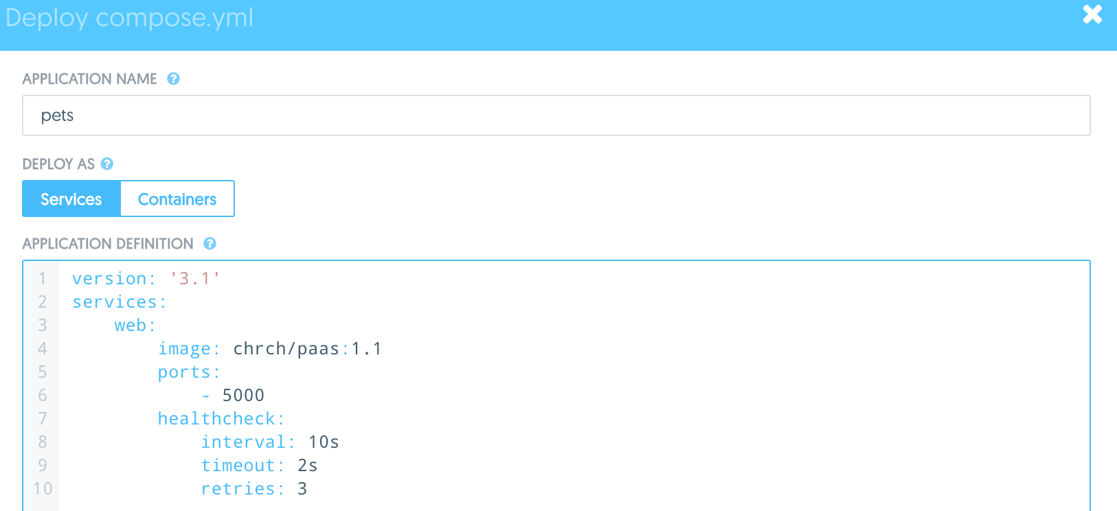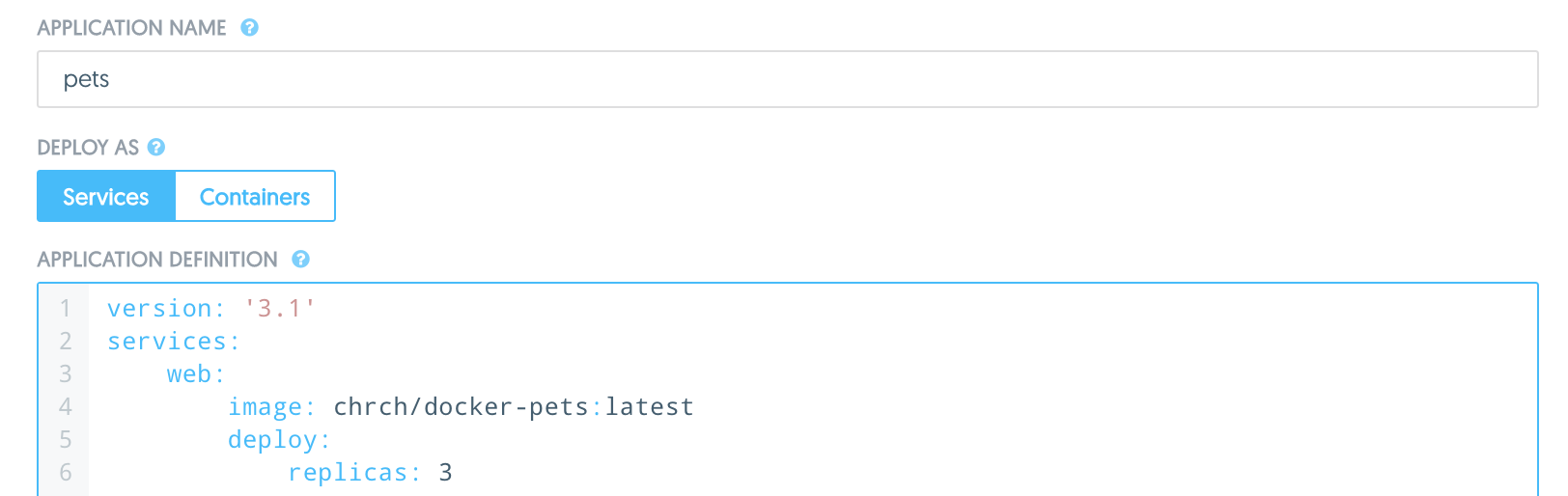 This is the first iteration of our compose file for the Docker Pets application: