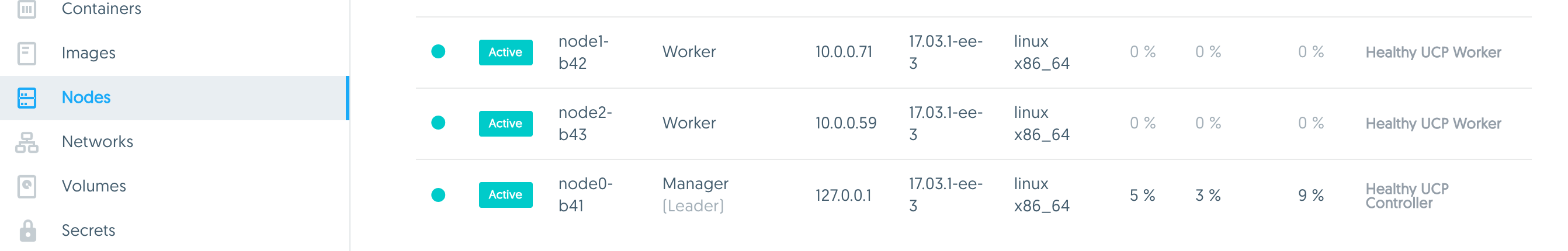 Go to the UCP GUI and click on Resources / Nodes. You should now see that all of your nodes listed with their respective role as Manager or Worker.