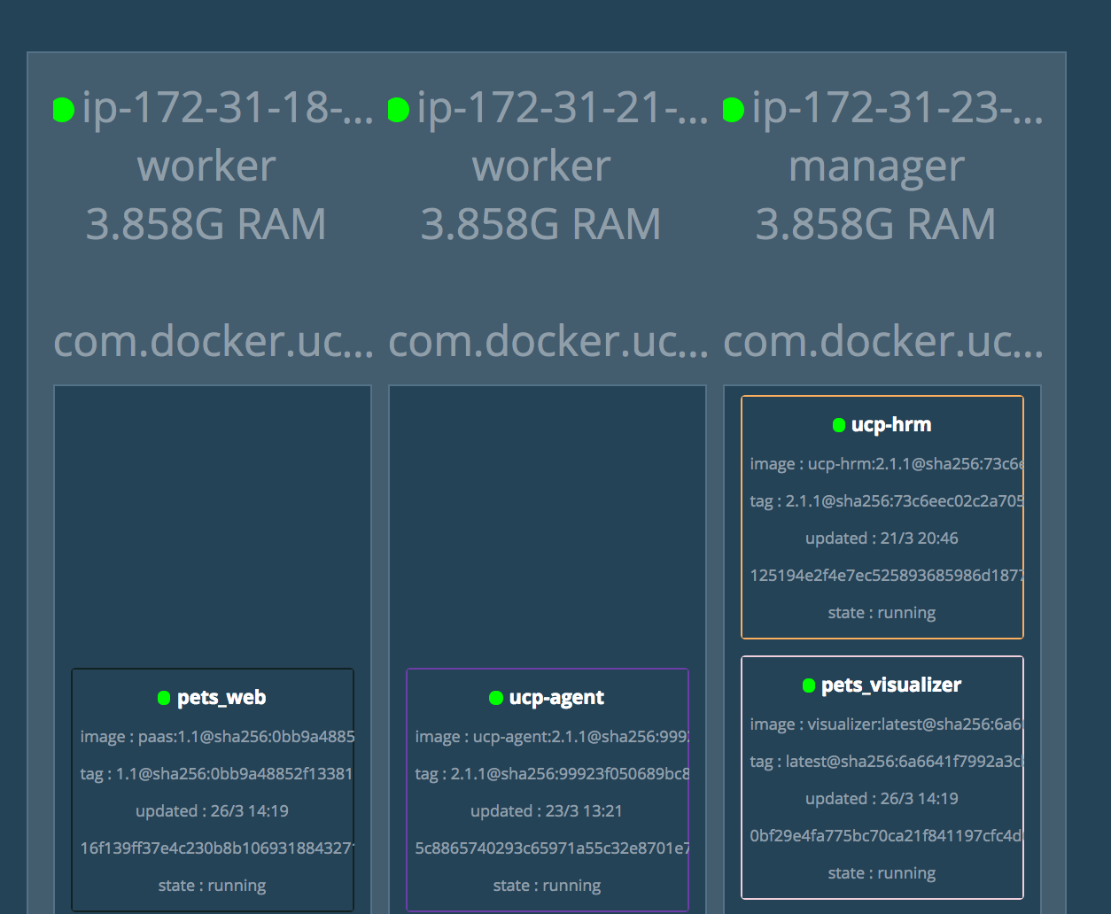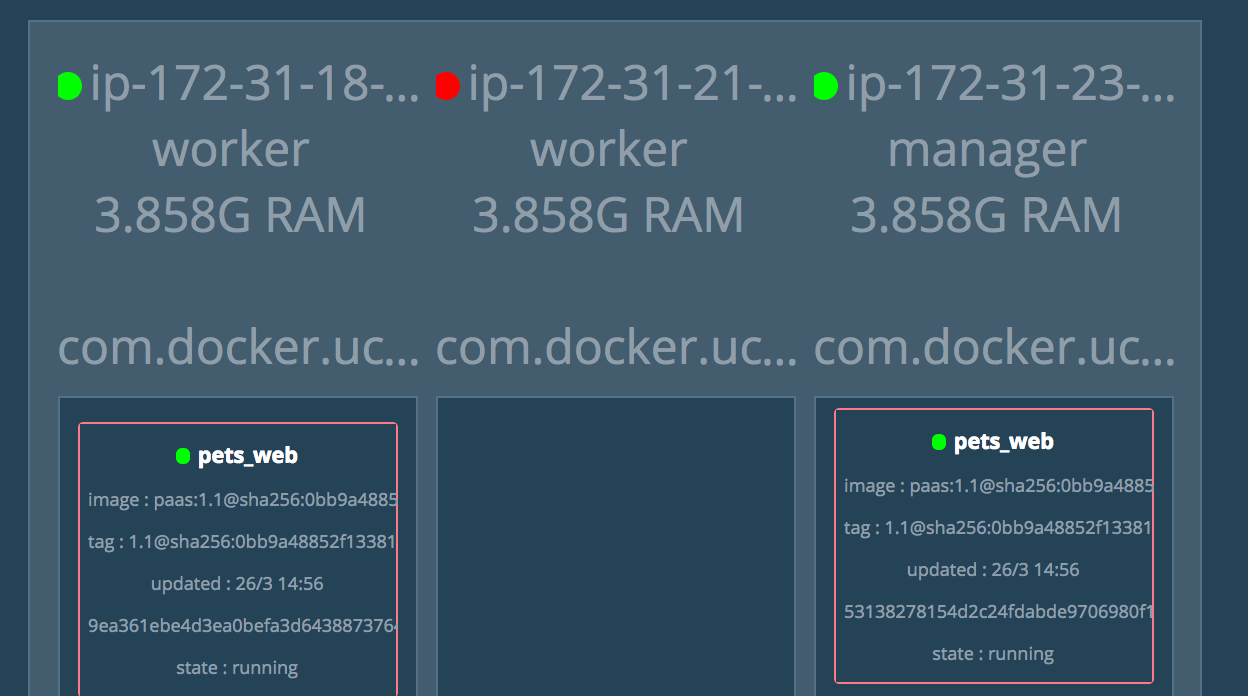 - Go to the Visualizer in your browser. You will see the healthcheck on one of the containers go to red. After a few more moments UCP will kill the container and reschedule another one. A default grace period is applied to allow existing application traffic to drain from this container. This simulates an application failure that is recovered by UCP.