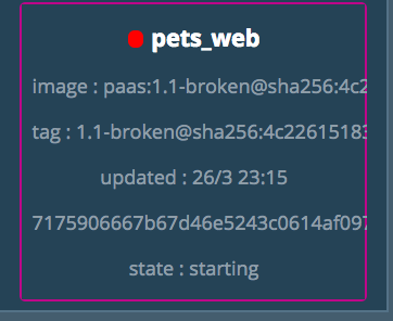 chrch/docker-pets:brokenimage is rolled out to a single container but it fails to pass it’s health check. The secondchrch/docker-pets:brokencontainer will start failing afterwards which will trigger the rolling update to pause.