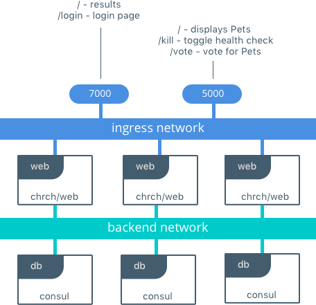 The resulting application will have 3 web frontend containers and 3 db consul containers. A backend network will be deployed for secure communication between web and db. The app is exposing HTTP endpoints for different services on ports 5000 and 7000. UCP will publish these ports on each node in the UCP cluster. Application traffic to any of the external ports will get load balanced to healthy containers.