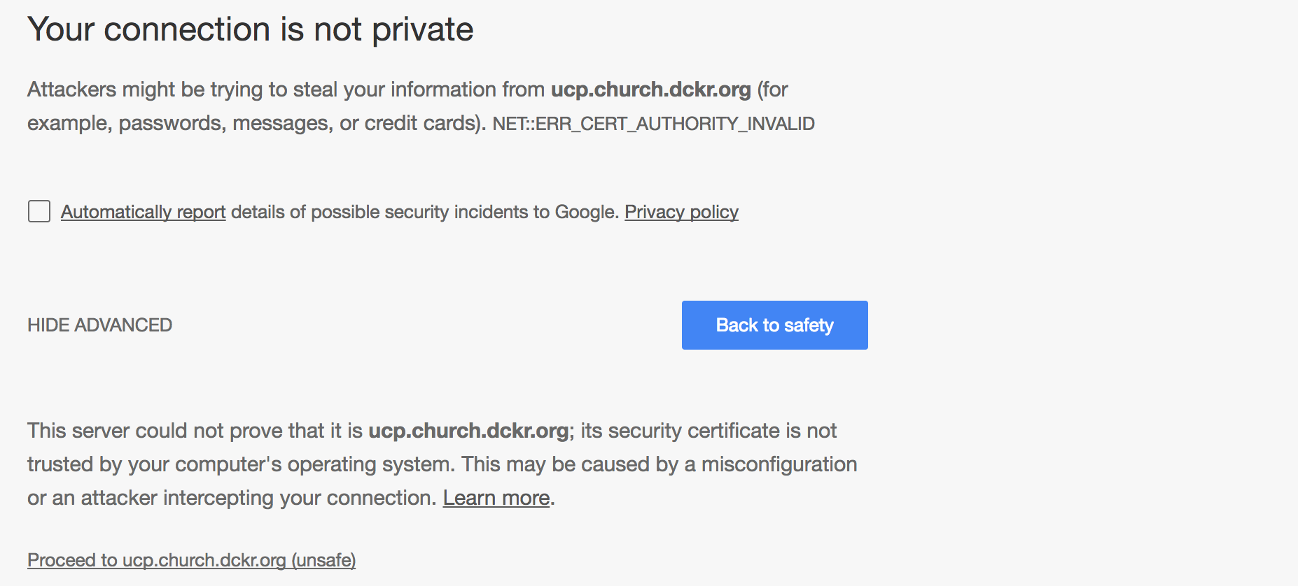 Depending on what browser you are using, you will receive a warning about the connection. Proceed through to the UCP URL. The warning is occuring because we UCP uses privately signed certificates by default. In a production installation we would add our own certificates that would be trusted by our browser.