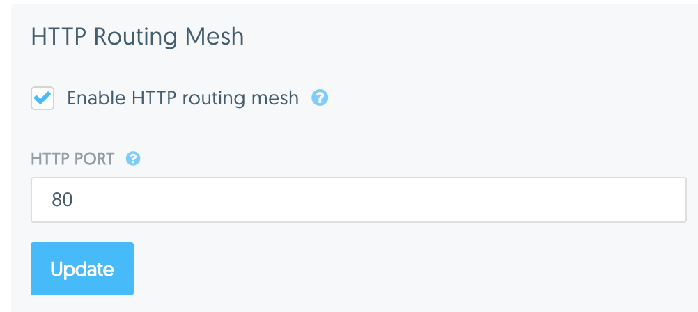 - In the UCP GUI go to Admin Settings / Routing Mesh. In this window, check the box to enable the routing mesh and ensure that it is serving HTTP traffic on port