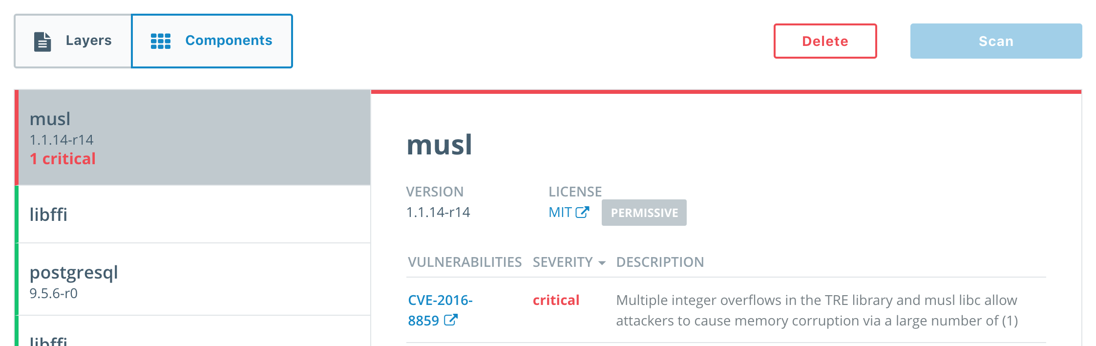 - Click on Components. The Components tab lists out all of the libraries in the image, arranged from highest to least severity. The CVE is shown in addition to the usage license of the component. If you click on the CVE link it will take you to the official description of the vulnerability.
