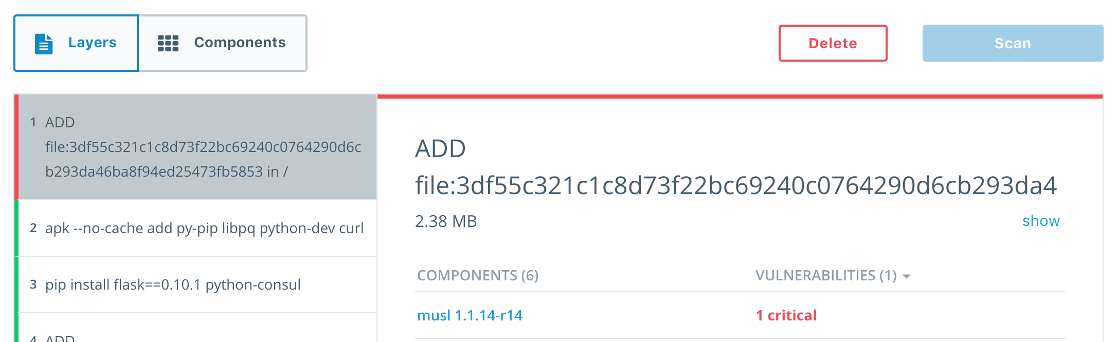 We identified that our application has the known vulnerability CVE-2016-8859. We can see in the Layers tab that the affected package musl 1.1.14-r14 is located in the top layer of our image. This is the base layer that was specified in the Dockerfile as FROM alpine:3.3. To remediate this we are going to use a more recent version of the alpine image, one that has this vulnerability fixed.
